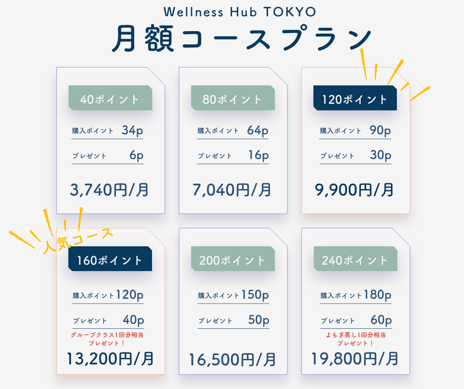 コースに応じてプレゼントポイントがございますので、実質無料でグループクラスやよもぎ蒸しを受けられるコースもあります。もちろん利用するサービスはお好きなものをお選びいただけますので、全てグループクラスに利用していただいても構いません。